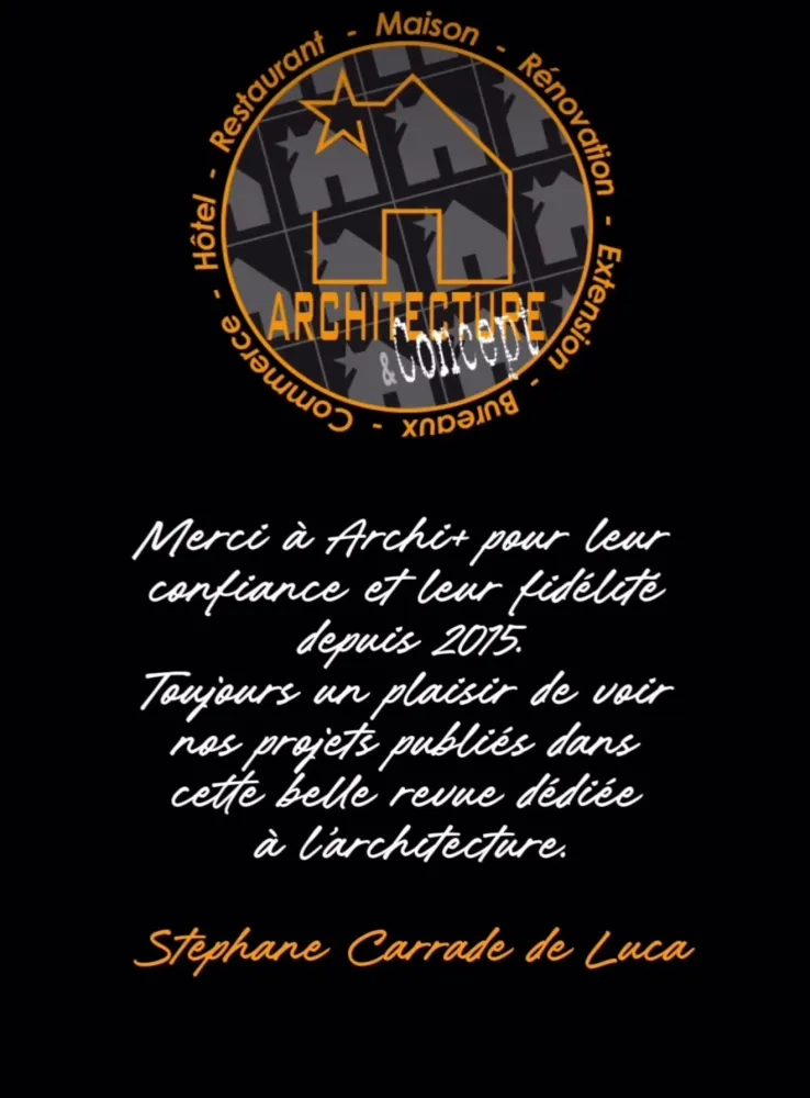 Dans le domaine de l’architecture, la reconnaissance par des acteurs spécialisés et par des médias dédiés constitue un véritable gage de crédibilité. C’est pourquoi je souhaite adresser un grand merci à Archi+ Tome 12 Toulouse et à Yves Daphé pour leur confiance et leur fidélité depuis 2015.