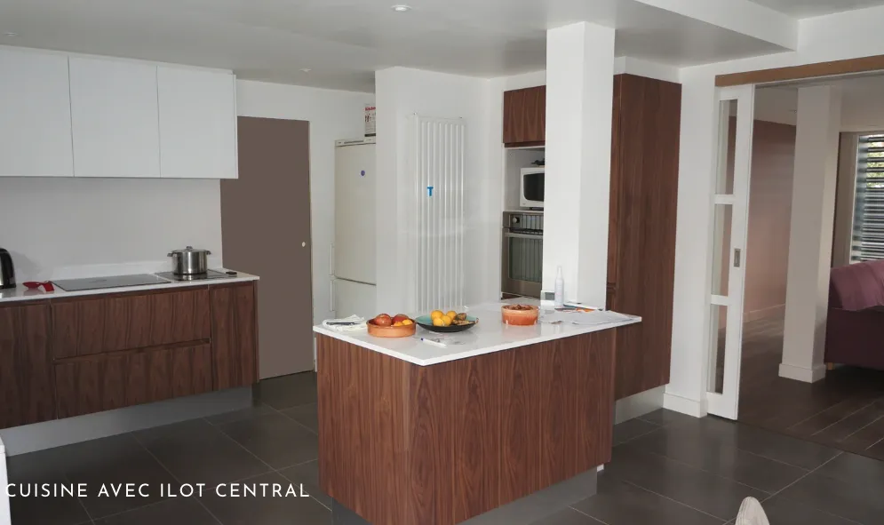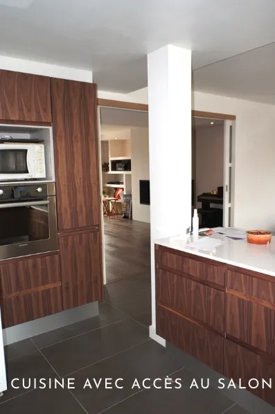 J’y ai intégré un salon spacieux, une cuisine ouverte et une salle à manger baignée de lumière. Une entrée distincte a été créée, distribuant un cellier, un WC séparé, ainsi qu’un bureau.