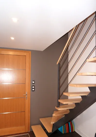 L’escalier a été déplacé et dessiné sur mesure pour créer une entrée contemporaine élégante, véritable point d’articulation entre les niveaux.