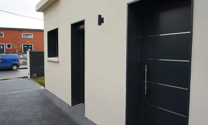 - Côté latéral: une voirie piétonne en revêtement drainant(DRAIN COLOR – Alcabat Naturesols), pensée pour allier esthétique et gestion des eaux pluviales
