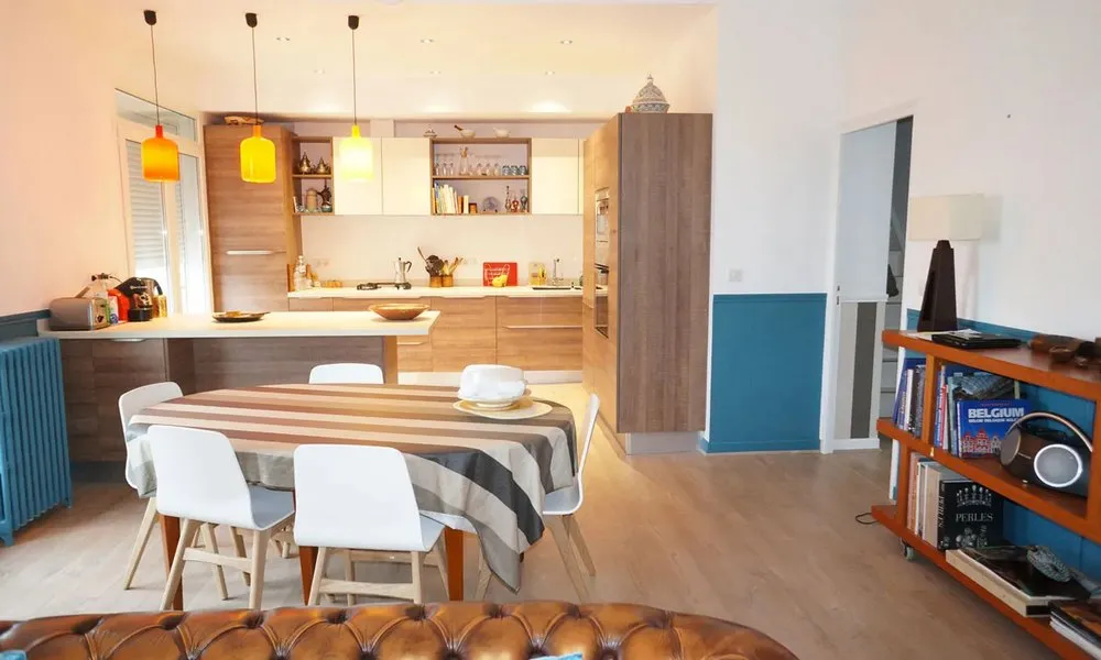J’ai créé une ouverture sur la cuisine afin de valoriser l’espace de vie et d’apporter davantage de fluidité visuelle.Le mobilier a été choisi ou adapté pour s’harmoniser avec les nouveaux matériaux, notamment avec le sol existant.