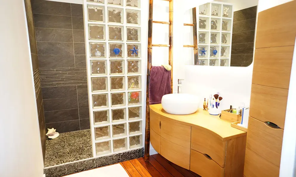 La salle de bain a été entièrement redessinée : une douche à l’italienne spacieuse, des meubles en teck, un jeu de matières naturelles pour une ambiance apaisante et élégante.
